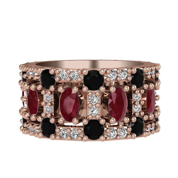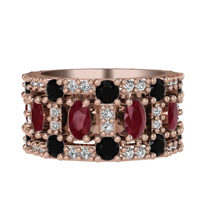 Kök yakut, siyah zirkon ve pırlanta 8 ayar rose altın yüzük (0.66 karat)
