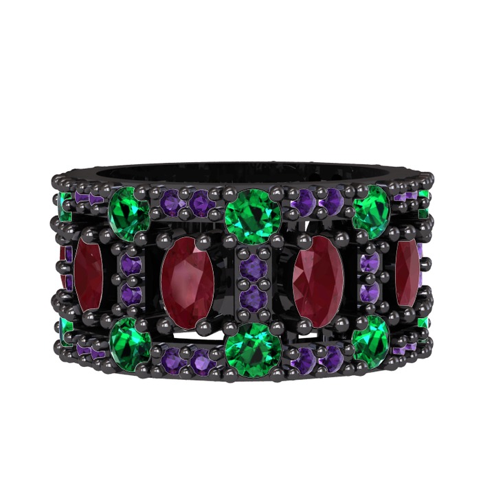 Kök yakut, yeşil kuvars ve ametist 925 ayar siyah rodyum kaplama gümüş yüzük