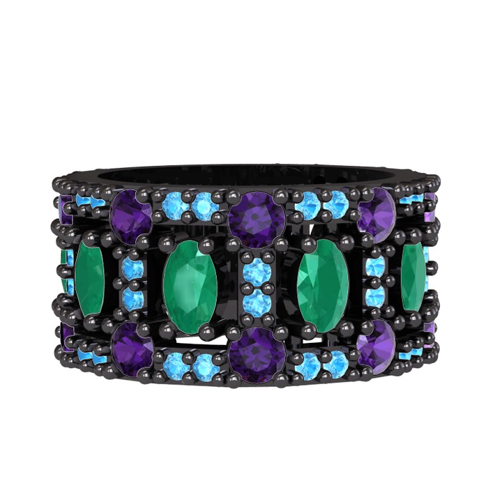 Kök zümrüt, ametist ve akuamarin 925 ayar siyah rodyum kaplama gümüş yüzük