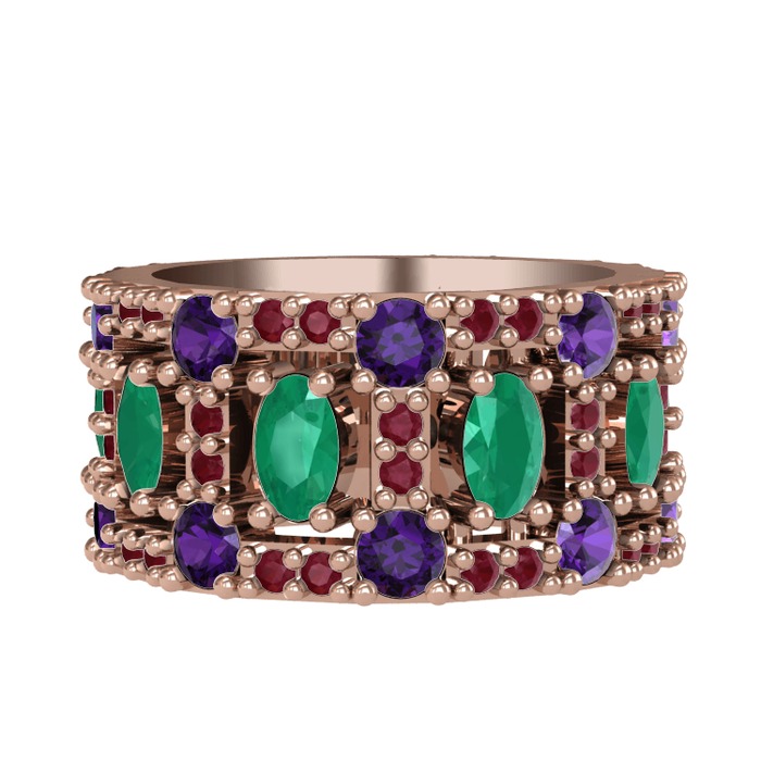 Kök zümrüt, ametist ve kök yakut 8 ayar rose altın yüzük