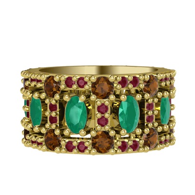 Kök zümrüt, dumanlı kuvars ve kök yakut 8 ayar altın yüzük