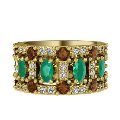 Kök zümrüt, dumanlı kuvars ve pırlanta 8 ayar altın yüzük (0.66 karat)