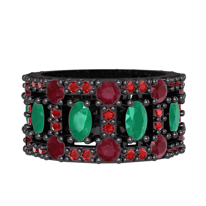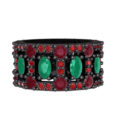 Kök zümrüt, kök yakut ve garnet 925 ayar siyah rodyum kaplama gümüş yüzük