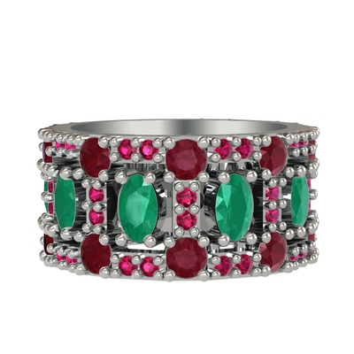 Kök zümrüt, kök yakut ve rodolit garnet 14 ayar beyaz altın yüzük
