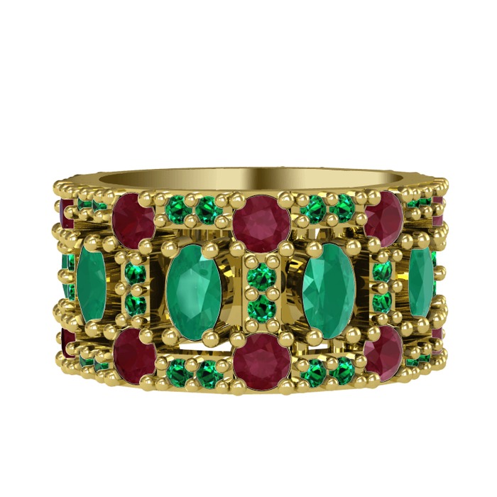 Kök zümrüt, kök yakut ve yeşil kuvars 8 ayar altın yüzük