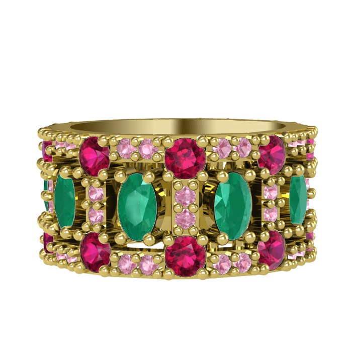 Kök zümrüt, rodolit garnet ve pembe kuvars 18 ayar altın yüzük