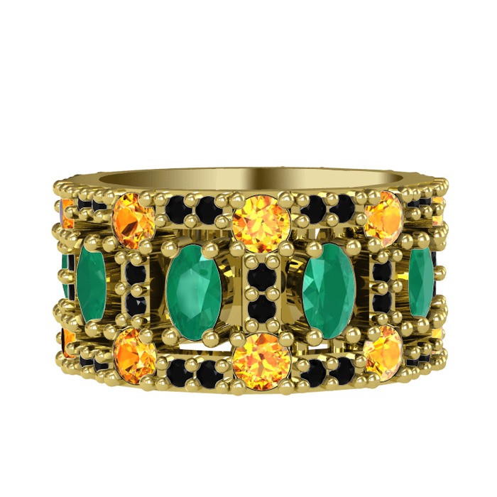 Kök zümrüt, sitrin ve siyah zirkon 14 ayar altın yüzük