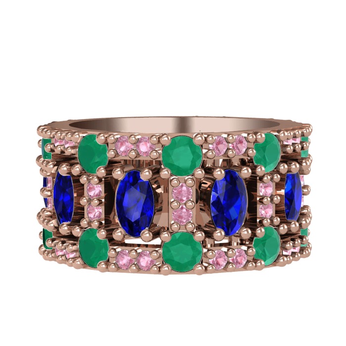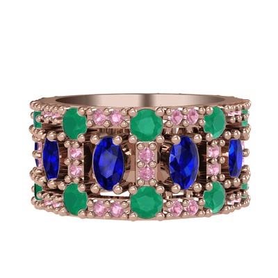Lab safir, kök zümrüt ve pembe kuvars 925 ayar rose altın kaplama gümüş yüzük