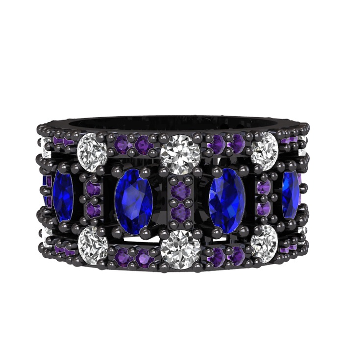 Lab safir, pırlanta ve ametist 925 ayar siyah rodyum kaplama gümüş yüzük (1.76 karat)