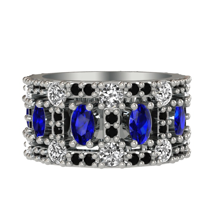 Lab safir, pırlanta ve siyah zirkon 8 ayar beyaz altın yüzük (1.76 karat)