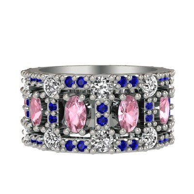 Pembe kuvars, beyaz zirkon ve lab safir 18 ayar beyaz altın yüzük