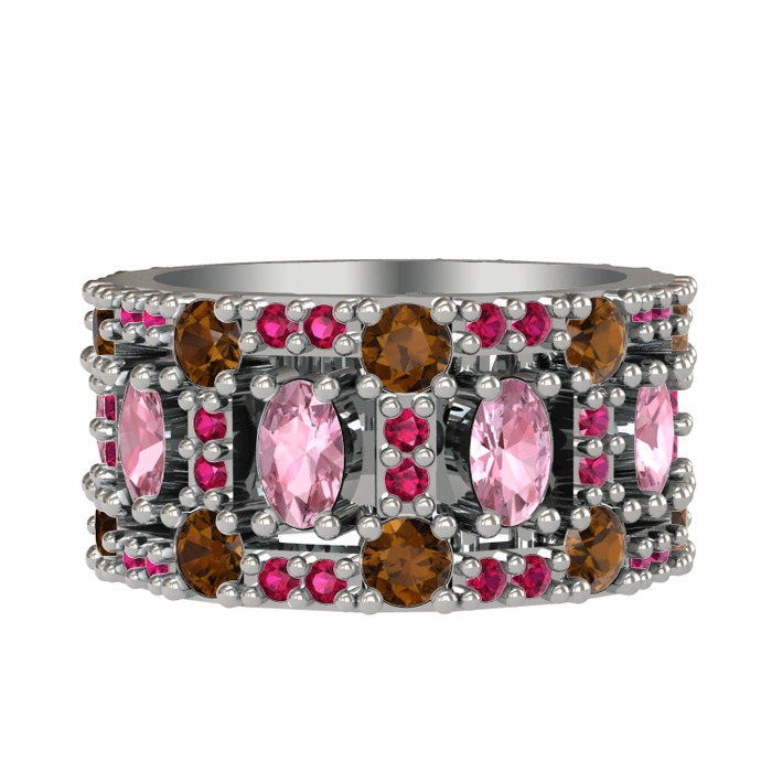 Pembe kuvars, dumanlı kuvars ve rodolit garnet 14 ayar beyaz altın yüzük