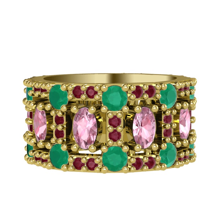 Pembe kuvars, kök zümrüt ve kök yakut 8 ayar altın yüzük