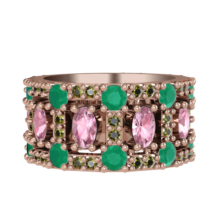Pembe kuvars, kök zümrüt ve peridot 925 ayar rose altın kaplama gümüş yüzük