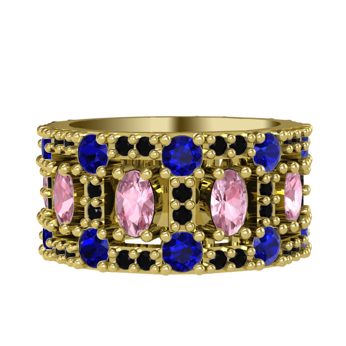 Pembe kuvars, lab safir ve siyah zirkon 18 ayar altın yüzük