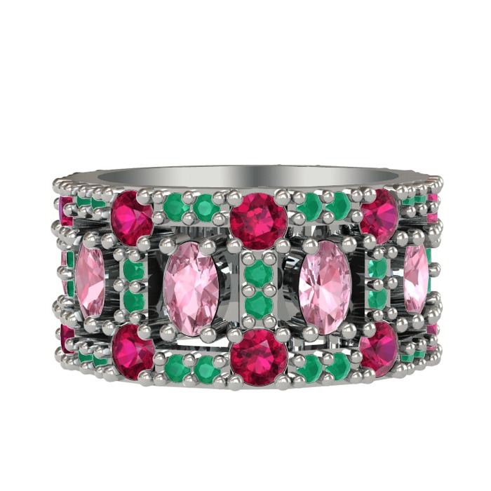 Pembe kuvars, rodolit garnet ve kök zümrüt 14 ayar beyaz altın yüzük