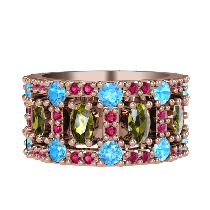Peridot, akuamarin ve rodolit garnet 14 ayar rose altın yüzük