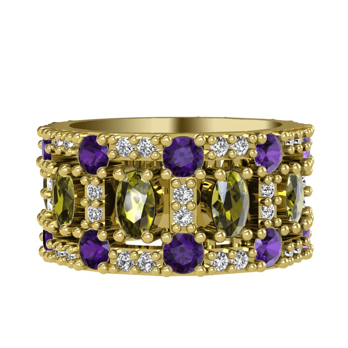 Peridot, ametist ve beyaz zirkon 8 ayar altın yüzük