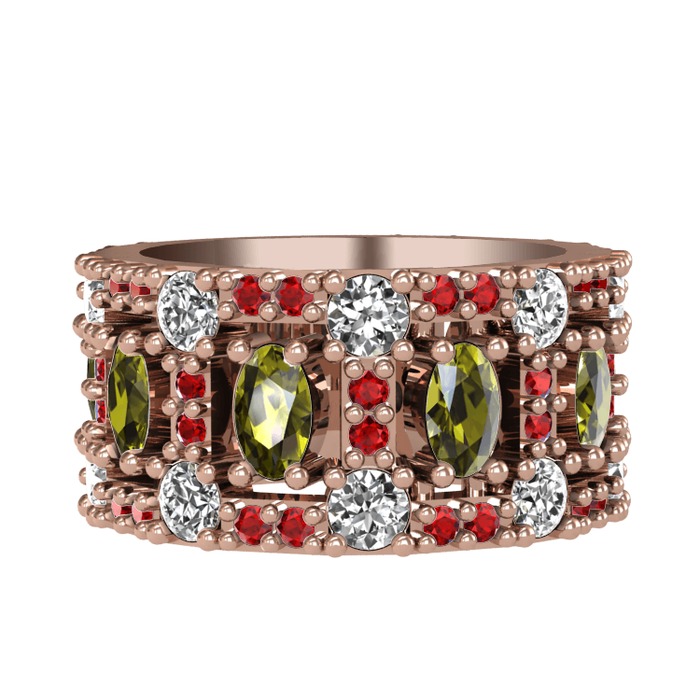 Peridot, beyaz zirkon ve garnet 14 ayar rose altın yüzük