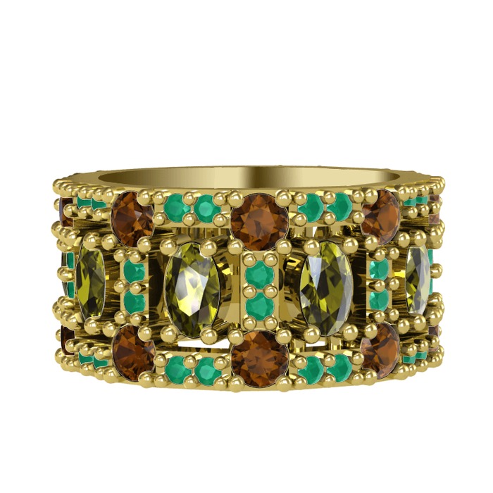 Peridot, dumanlı kuvars ve kök zümrüt 14 ayar altın yüzük