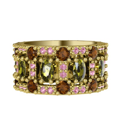 Peridot, dumanlı kuvars ve pembe kuvars 14 ayar altın yüzük
