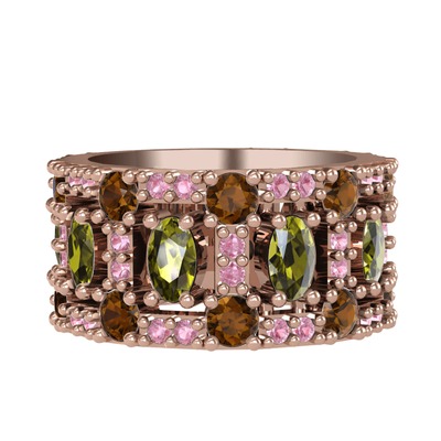 Peridot, dumanlı kuvars ve pembe kuvars 925 ayar rose altın kaplama gümüş yüzük