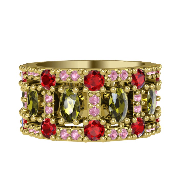 Peridot, garnet ve pembe kuvars 925 ayar altın kaplama gümüş yüzük