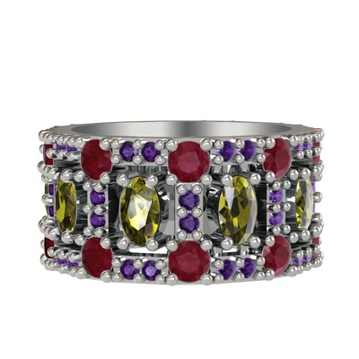 Peridot, kök yakut ve ametist 8 ayar beyaz altın yüzük