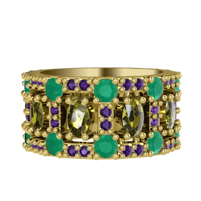 Peridot, kök zümrüt ve ametist 8 ayar altın yüzük