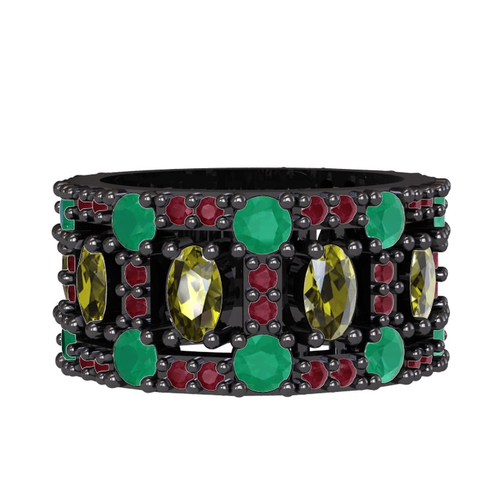 Peridot, kök zümrüt ve kök yakut 925 ayar siyah rodyum kaplama gümüş yüzük