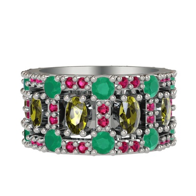Peridot, kök zümrüt ve rodolit garnet 18 ayar beyaz altın yüzük