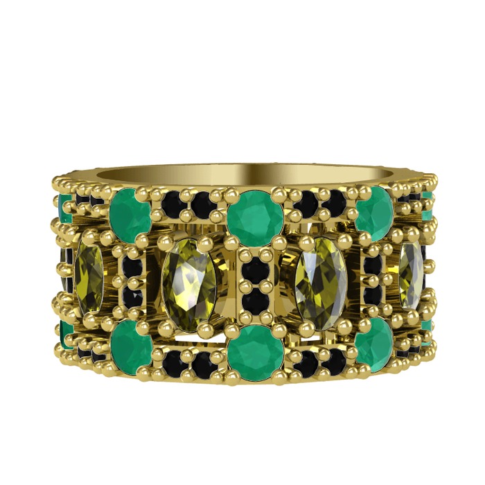 Peridot, kök zümrüt ve siyah zirkon 14 ayar altın yüzük
