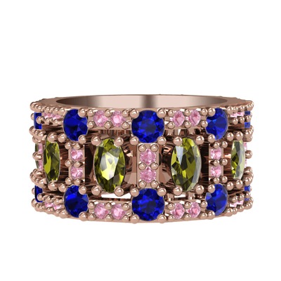 Peridot, lab safir ve pembe kuvars 18 ayar rose altın yüzük