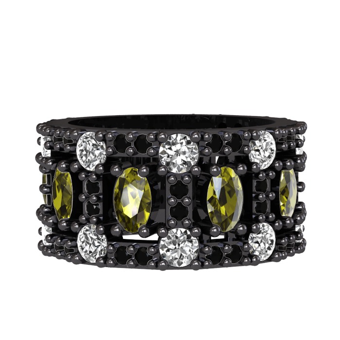 Peridot, pırlanta ve siyah zirkon 925 ayar siyah rodyum kaplama gümüş yüzük (1.76 karat)