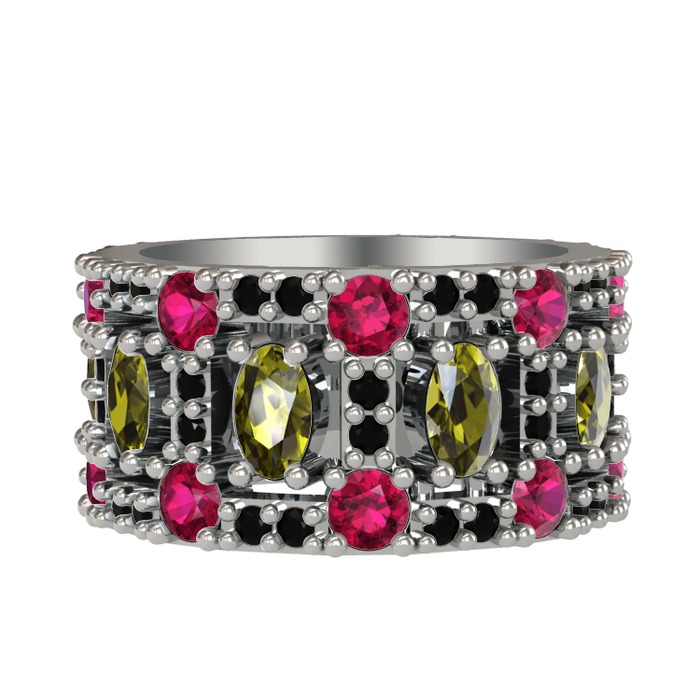 Peridot, rodolit garnet ve siyah zirkon 18 ayar beyaz altın yüzük
