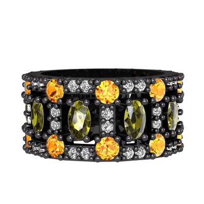Peridot, sitrin ve pırlanta 925 ayar siyah rodyum kaplama gümüş yüzük (0.66 karat)