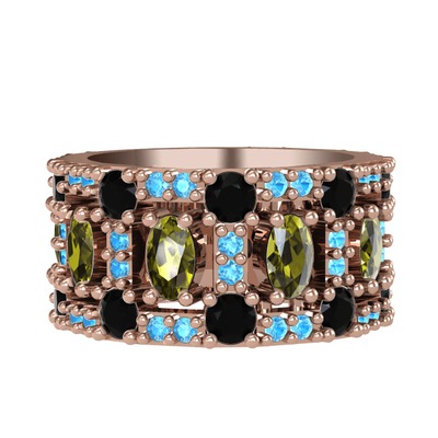 Peridot, siyah zirkon ve akuamarin 925 ayar rose altın kaplama gümüş yüzük