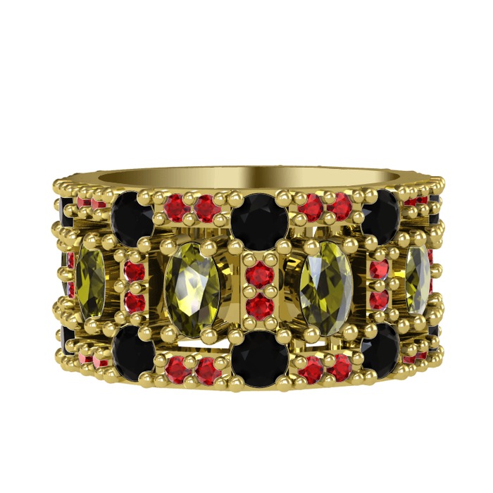 Peridot, siyah zirkon ve garnet 14 ayar altın yüzük