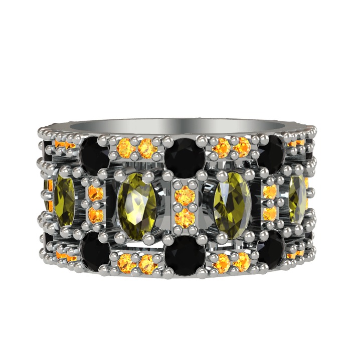 Peridot, siyah zirkon ve sitrin 18 ayar beyaz altın yüzük