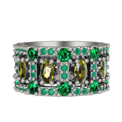 Peridot, yeşil kuvars ve kök zümrüt 8 ayar beyaz altın yüzük