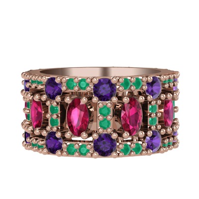 Rodolit garnet, ametist ve kök zümrüt 18 ayar rose altın yüzük