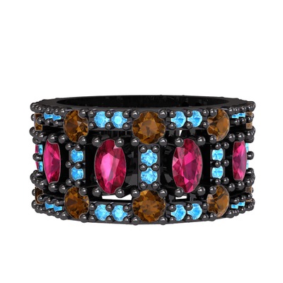 Rodolit garnet, dumanlı kuvars ve akuamarin 925 ayar siyah rodyum kaplama gümüş yüzük