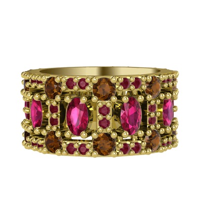 Rodolit garnet, dumanlı kuvars ve kök yakut 8 ayar altın yüzük