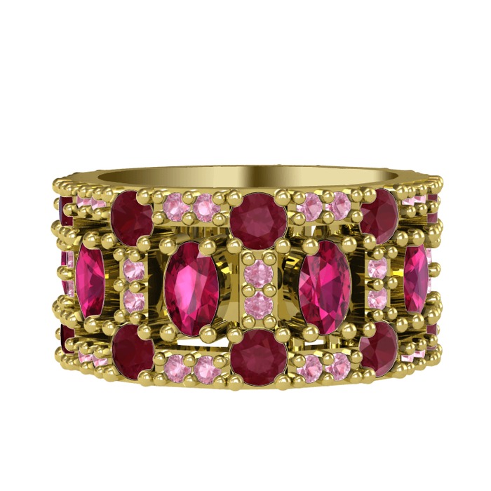 Rodolit garnet, kök yakut ve pembe kuvars 925 ayar altın kaplama gümüş yüzük