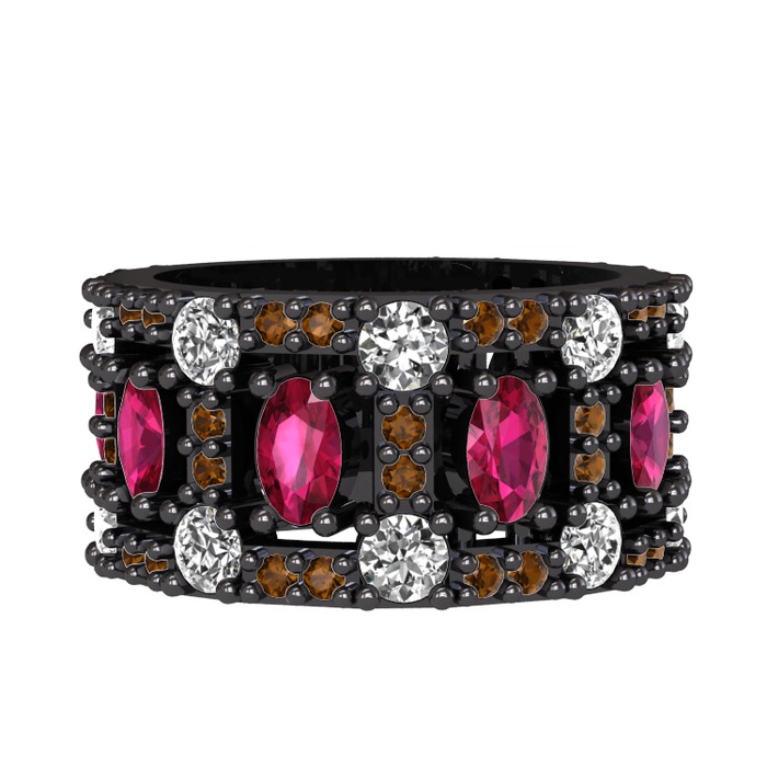 Rodolit garnet, pırlanta ve dumanlı kuvars 925 ayar siyah rodyum kaplama gümüş yüzük (1.76 karat)
