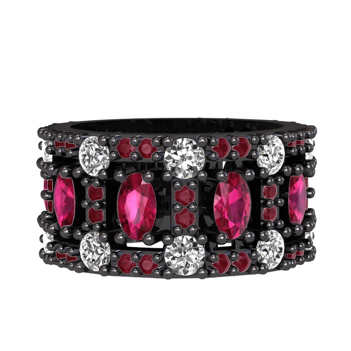 Rodolit garnet, pırlanta ve kök yakut 925 ayar siyah rodyum kaplama gümüş yüzük (1.76 karat)