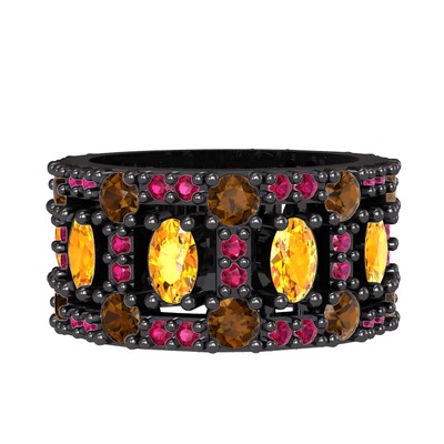 Sitrin, dumanlı kuvars ve rodolit garnet 925 ayar siyah rodyum kaplama gümüş yüzük