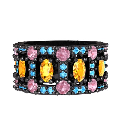 Sitrin, pembe kuvars ve akuamarin 925 ayar siyah rodyum kaplama gümüş yüzük