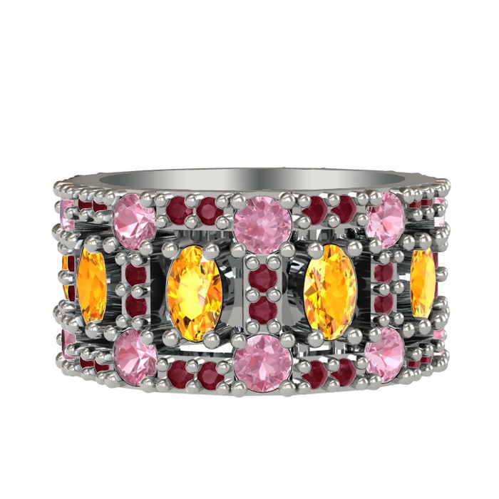 Sitrin, pembe kuvars ve kök yakut 8 ayar beyaz altın yüzük