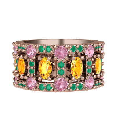 Sitrin, pembe kuvars ve kök zümrüt 925 ayar rose altın kaplama gümüş yüzük